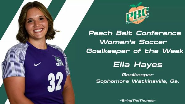 Sophomore women’s soccer player Ella Hayes won the honors of Peach Belt Conference Goalkeeper of the Week for her elite performance in protecting the goal during the week ending on Oct. 13. The Watkinsville, Georgia native played 180 minutes between the posts, facing 15 shots, seven of which were on goal, across her two games that week, to which she just allowed a single goal. Hayes helped the Bobcats shut down the University of South Carolina-Aiken Pacers 1-0 for a Senior Day victory.